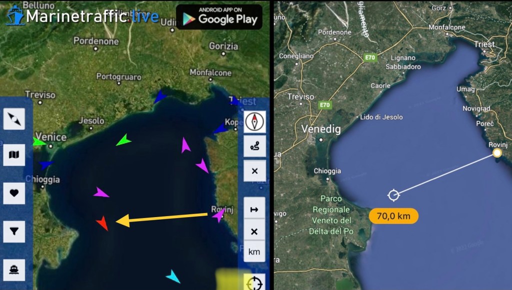 - Entfernung zum Schiff: laut GPS-Datenanzeige ca. 70 km