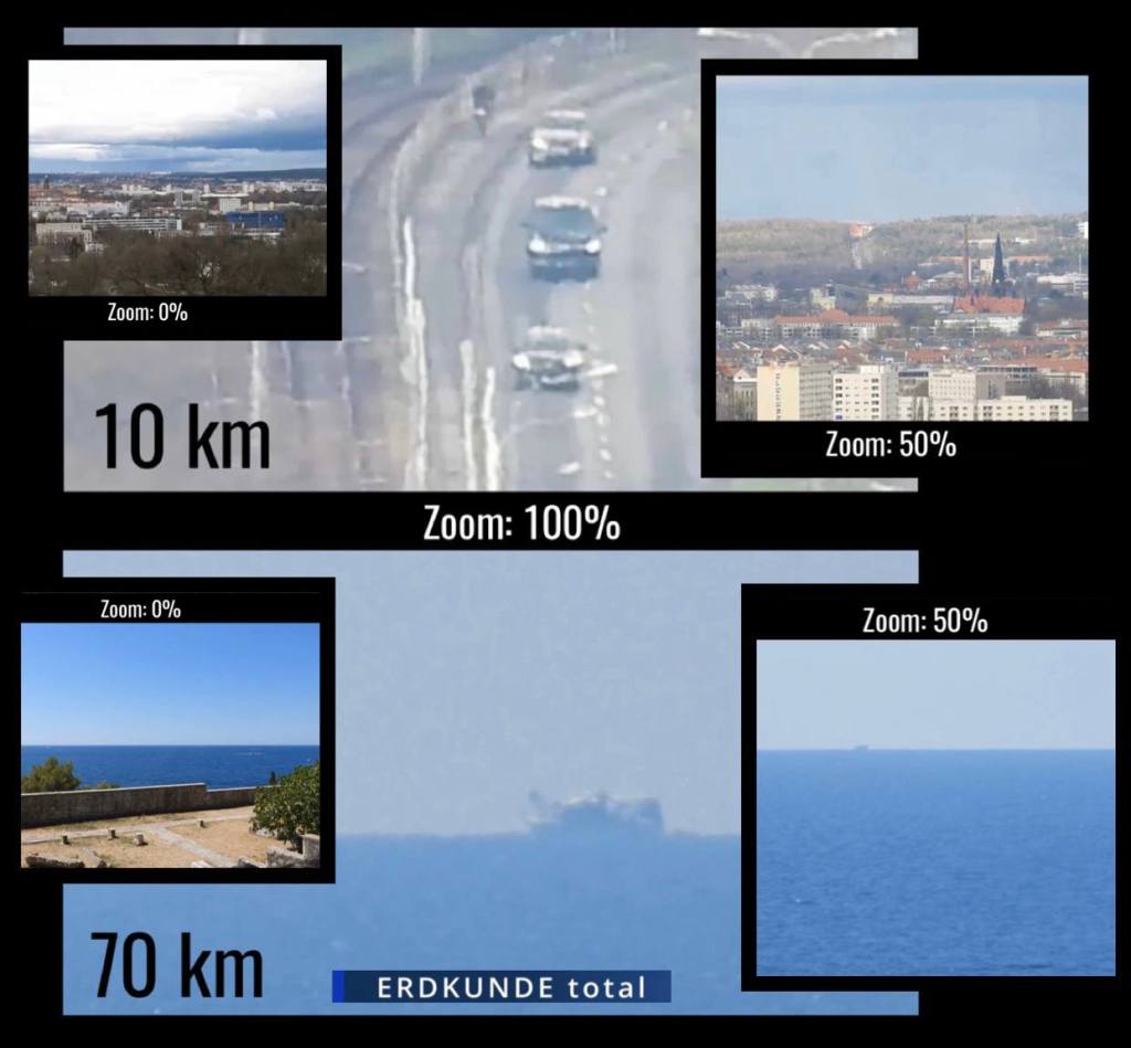 Wenn du zwei Objekte in 10 km und 70 km Entfernung gleich klar siehst – obwohl eines angeblich „hinter der Krümmung“ liegen müsste –, dann bleibt nur ein Fazit: